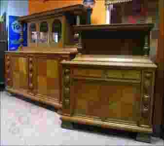 Piękny, dębowy komplet secesyjny z przełomu XIX/XXw. w skład którego wchodzi kredens i komoda. Drzwi z kasetonami fornirowanymi w szachownicę, okraszone po bokach gustowną snycerką. Bryły mebli wsparte na nogach również zdobionych snycerką. Nadstawki ozdobione po bokach przepięknymi kolumnami, zarówno kredens jak i komoda z dodatkowymi wysuwanymi blatami. Nadstawka kredensu ze szlifowanymi szybami. Na innych aukcjach wystawiamy stół z krzesłami oraz fotele, które mogą stanowić razem piękny, duży komplet.