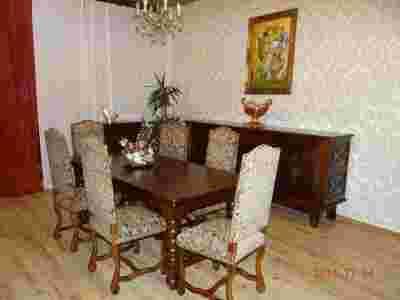Komplet jadalny: stół dębowy + komplet krzeseł + komoda dębowa + dębowa szafka.