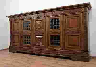 Mebel o drewnianej konstrukcji zwieńczony lekko wysuniętym gzymsem dekorowanym w płaskorzeźby przedstawiające znaki zodiaku.
