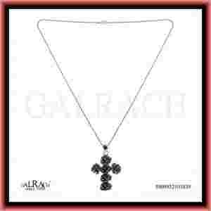 Duży, artystyczny, okazały naszyjnik w kształcie krzyża zdobionego różyczkami.