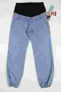 OKAY mama super dżinsowe spodnie dla przyszłej mamy. Kolor niebieski. W pasie bawełniany czarny pas, kieszonki, imitacja zamka, na dole nogawek wciągnięta gumka. Spodnie wykonane z cienkiego dżinsu, idealne na ciepłe dni. Nowe z metką.