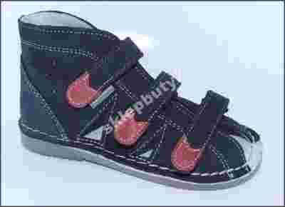 Buciki w kolorze granatowym, z czerwonymi elementami na rzepach.