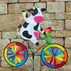 Dwa koła roweru o kolorach tęczy zaczynają poruszać się już przy niewielkiej bryzie zapewniając przyjemny widok. Biker Cow został wykonany z najwyższą starannością o szczegóły. W przedniej części roweru znajduje się koszyk, w którym krówka wiezie kwiaty. Piękna aranżacja cieszy oko. Ta ozdoba będzie źródłem radości przez wiele lat.