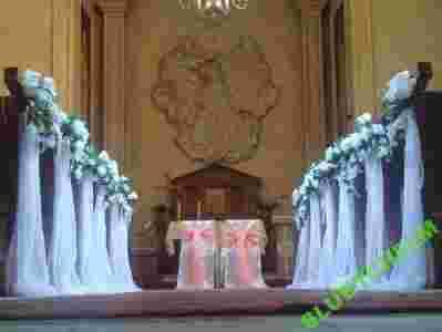 lub zwisające stroiki z białym welonem mocowane do ławek każdej ławki ok. 24 szt szarfa łącząca stojaki na długości alejki,