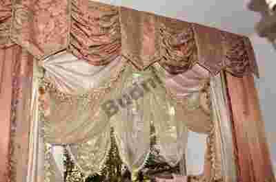 Piękny marszczony lambrekin, na podszewce, wykończony ozdobnym sznurem.