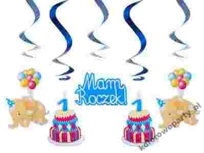 Dekoracja wisząca świderek urodzinowy to pięć łańcuchów - świderków z folii holograficznej z kolorowymi słonikami, tortami oraz napisem Mam Roczek z cienkiego ale sztywnego kartonika, każdy o długości ok. 60 cm.