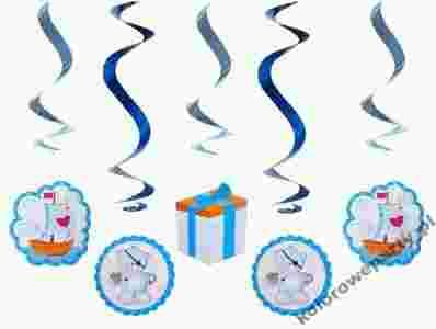Dekoracja wisząca świderek to pięć łańcuchów - świderków z folii holograficznej z kolorowymi misiami, statkami oraz prezentem z cienkiego ale sztywnego kartonika, każdy o długości ok. 60 cm.