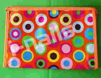 Duża damska, pojemna kosmetyczka zapinana na suwak. Jedna komora, wewnątrz bez podszewki, kosmetyczka wykonana z tkaniny połyskująca satyna. Bardzo duża i pojemna - pomieści sporo kosmetyków pielęgnacyjnych. Wymiary: 28,5cm szerokość, 19cm wysokość, 7cm szerokość dna. Dostępne są różne kolory: koła na pomarańczowy, różowym lub zielonym tle.