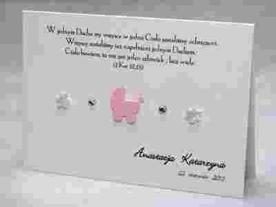 to eleganckie ręcznie wykonane zaproszenia na Chrzest Święty i Roczek. Zrobione są z wysokiej jakości tłoczonego białego o strukturze tkaniny lnianej lub kratki. Na froncie znajduje się niebieska lub różowa dziecięca aplikacja, dwie cyrkonie oraz dwa satynowe kwiatuszki - białe, różowe, kremowe lub niebieskie. Papierowa aplikacja oraz satynowe kwiatuszki zamocowane są na specjalnych 2 mm gąbeczkach.