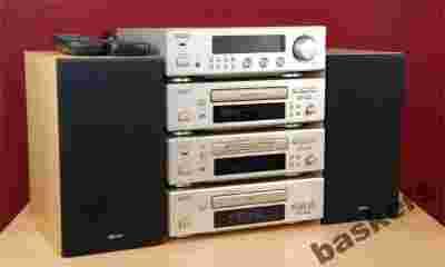 Do zaoferowania mam przepięknie wykonaną wieżę, która jeszcze nie dawno gościła na sklepowych półkach. Zestaw ten składa się z amplitunera, odtwarzacza cd, odtwarzacza kasetowego, pilota, kabli połączeniowych oraz kolumn . Sprzęcik prezentuje się bardzo okazale. Wszystko to za sprawą ekskluzywnego wykonania. Mamy tutaj do czynienia z aluminiowymi panelami oraz perfekcyjnym wykonaniem. Efekt dzieła projektantów można obejrzeć na fotkach. Taka wieża idealnie nadaje się do salonów i gabinetów utrzymanych w "dobrym stylu". Jest po prostu tak piękna że może służyć jako mebel. Ale myli się ten kto myśli że mikro wieża kiepsko zagra. Sam amplituner i cd są zbudowane podobnie jak duże klocki tej firmy. Najfajniejsze w tej wieży jest to, iż pomimo niewielkiego rozmiaru , ma w sobie wszystkie funkcje dużego zestawu, a nawet więcej. Wieża prezentuje się przepięknie i gra nie gorzej. Amplituner waży ponad 4kg, czyli tyle co lżejsze wzmacniacze Denona. Urządzenie jest świetnie zbudowane, zwarte i masywne. Panel przedni wykonany z grubego aluminium. Wewnątrz widać sporej wielkości transformator, jak na takie urządzenie i kondensatory filtrujące o pojemności 2 x 4700 uF. Moc 2 x 30 W przy 4ohm. Wzmacniacz posiada możliwość korekcji: 'Balance', "Treble' i 'Bass' oraz komplet 5 wejść (wraz z gramofonowym) i 2 wyjść. Tak bogate wyposażenie NIE! jest standardem dla większości mini wież obecnych na rynku, nawet wśród bardziej renomowanych producentów, stąd Denon DRA-F100 stanowi wyjątek. Całości dopełnia wysokiej jakości tuner radiowy wraz z rozbudowanym systemem RDS EON. Sprzęt godny polecenia. Zestaw ten składa się z 4 elementów ( amplituner, odtwarzacz cd, odtwarzacz magnetofonowy, odtwarzacz md) oraz kolumn.