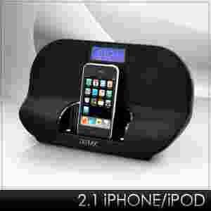 Urządzenie obsługujące iPody/ iPhony, połączone z radiem. Wejście AUX umożliwia rozszerzenie możliwości urządzenia. Zestaw stereo iPod wyposażony jest w radiobudzik, korzystający do wyboru z sygnałów z iPoda, radia lub standardowego alarmu.