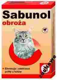 Obroża Sabunol to nowoczesny, wieloskładnikowy preparat do zwalczania i odstraszania pcheł u kotów. Dzięki zastosowaniu specjalnych perforacji, umożliwiających zrywanie obroży przy nagłym obciążeniu, jest całkowicie bezpieczna dla kotów. Zawiera dwie substancje aktywne: imidaklopryd i piryproksyfen, co gwarantuje duża skuteczność działania.