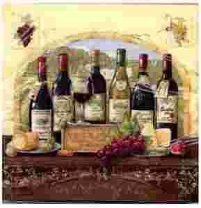 Wielobarwne serwetki papierowe zdobione rysunkiem butelek z winem, niemieckiej firmy PPD (Paperproducts Design). Serwetki są trójwarstwowe po rozłożeniu mają wymiar 33 cm x 33 cm.