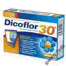 Dicoflor 30 przeznaczony jest dla dzieci powzej 3 lat. Ma potwierdzone bezpieczeństwo stosowania u różnych grup pacjentów, między innymi: wcześniaków, kobiet w ciąży i karmiących piersią, pacjentów onkologicznych, osób z zaburzeniami trawienia i wchłaniania. Dicoflor zawiera żywe kultury bakterii probiotycznych szczepu Lactobacillus rhamnosus GG. Stosowany równolegle z antybiotykiem obniża ryzyko skutków ubocznych terapii. Dodatkowo może być stosowany profilaktycznie w celu wspomagania odporności.