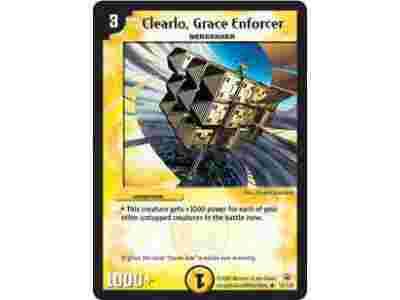 Name: Clearlo, Grace Enforcer Cost: 3 Race: Berserker Civilization: Light Type: Creature Rules Text: This creature gets +1000 power for each of your other untapped creatures in the battle zone. Flavor Text: It gives the term "boom box" a whole new meaning. Power: 1,000 Mana Number: 1 Artist: Atsushi Kawasaki Rarity: U Collector Number: 13