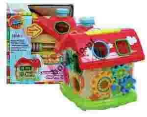 Domek poprzez swoje kształty i kolory z pewnością przykuje uwagę małego dziecka. Zabawka zawiera także inne atrakcje, w postaci obracanej kuli z grzechotką, liczydła, obracanego bębenka z obrazkami, obracanych trybów i komina z piszczkiem. Domek edukacyjny posiada także ergonomiczny uchwyt, który można wyciągać przy przenoszeniu zabawki.