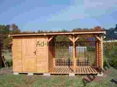 Drogi kliencie dziękujemy za zainteresowanie się naszą ofertą. Oferujemy domek narzędziowy o wymiarach 2m x 2m, połączony z drewutnią 2m x 3m wykonany z drewna sosnowego. Konstrukcja drewutni oparta jest na słupach 9cm x 9cm co zapewnia bardzo solidną konstrukcję. Ściany wykonane zostały z kantówki i desek boazeryjnych. Dach wykonany jest z desek boazeryjnych, pokryty gontem bitumicznym firmy Technonicol ( wzór i kolor gontu do wyboru klienta ). Domek posiada drzwi z klamką i zamkiem GERDA. Domek malowany jest dwukrotnie ekologicznym impregnatem DREWNOCHRON z domieszką wosku. Kolor prezentowanego domku to "TIK". Gont w kolorze czerwonym.