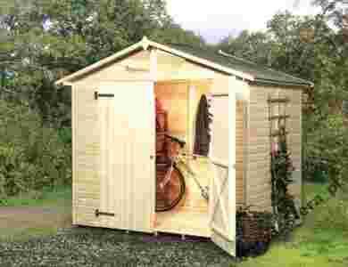 Drewniany domek narzędziowy z dwuspadowym dachem i podłogą.