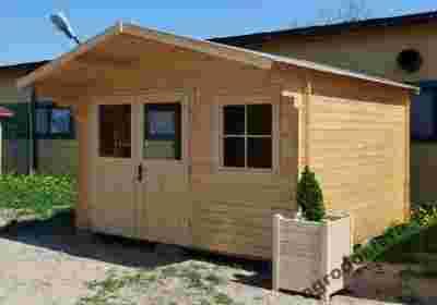 Przestronny domek ogrodowy z 2 oknami oraz dwu skrzydłowymi drzwiami.