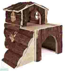 Piętrowy domek dla gryzoni składa się z dużego domku parterowego, schodów prowadzących na taras oraz mniejszego domku na piętrze. Doskonale wypełnia przestrzeń w klatce, dzięki schodkom skłania do aktywności i zabawy.