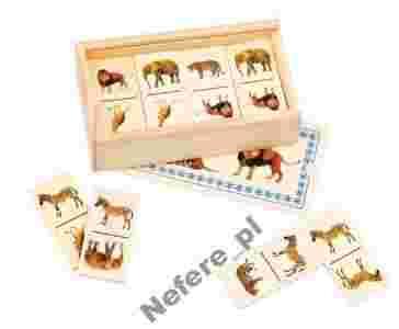 Domino to popularna gra, która polega na dopasowaniu drewnianych elementów pasujących do siebie np. lew do lwa, słoń do słonia tak, aby stykały się ze sobą obrazkami.
