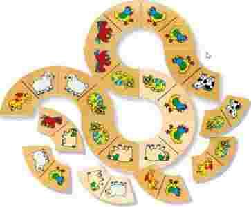 Domino to popularna gra, która polega na dopasowaniu drewnianych elementów pasujących do siebie np. pieska do pieska lub owieczki do owieczki, tak aby stykały się ze sobą obrazkami. Prezentowana gra to doskonała pomoc dydaktyczna, pozytywnie wpływająca na rozwój mowy małych dzieci oraz rozwijająca koordynację wzrokowo-ruchową.