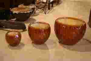 Komplet szkliwionych donic ceramicznych (3 szt.) w ciemno miodowym kolorze i fakturze plastra miodu.