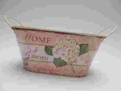 Doniczka Hortensja wykonana jest z metalu w kremowym kolorze, oklejona nadrukiem z motywem hortensji oraz napisem home, posiada dwa metalowe uchwyty, które ułątwią przenoszenie.
