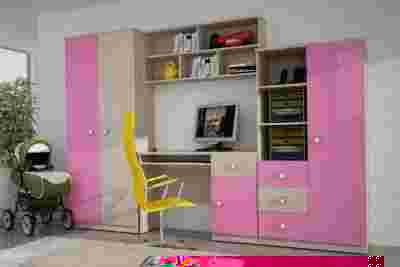 Zestaw wykonany jest z wysokiej jakości płyty laminowanej o grubości 16mm w kolorystyce: korpus - Jesion / Front - Zielony / Różowy / Pomarańcz