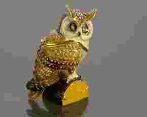 Sowa - urzekająca szkatułka (metal), nawiązująca do dzieł słynnego jubilera Petera Carla Faberge (1[zasłonięte]846-19).