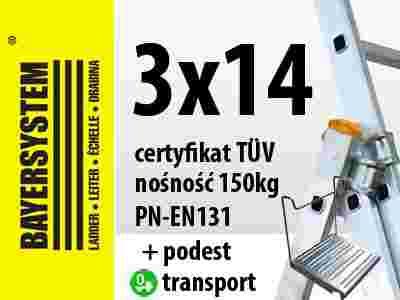 Aluminiowa drabina wielofunkcyjna 3x14 jest znakomitym produktem firmy BAYERSYSTEM. Posiada normę PN EN 131 oraz potwierdzoną nośność na stopień 150kg. Drabina dwustronna z możliwością pionowego rozłożenia i przystawienia np. do ściany budynku. Dodatkowo możliwość wysunięcia trzeciego elementu spełnia funkcję drabiny wolnostojącej. Przed niezamierzonym zsunięciem się elementów wysuwanych drabiny zabezpieczają haki. Bezpieczeństwo zapewniają antypoślizgowe stopnie, szeroki stabilizator umieszczony u jednej z podstaw drabiny, stópki antypoślizgowe z tworzywa sztucznego oraz linka uniemożliwiająca rozsunięcie się drabiny.