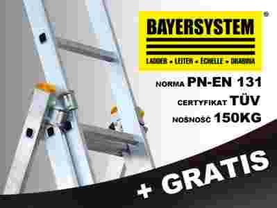 Aluminiowa drabina wielofunkcyjna 3x14 jest znakomitym produktem firmy BAYERSYSTEM. Posiada normę PN EN 131 oraz potwierdzoną nośność na stopień 150kg. Drabina dwustronna z możliwością pionowego rozłożenia i przystawienia np. do ściany budynku. Dodatkowo możliwość wysunięcia trzeciego elementu spełnia funkcję drabiny wolnostojącej. Przed niezamierzonym zsunięciem się elementów wysuwanych drabiny zabezpieczają haki. Bezpieczeństwo zapewniają antypoślizgowe stopnie, szeroki stabilizator umieszczony u jednej z podstaw drabiny, stópki antypoślizgowe z tworzywa sztucznego oraz linka uniemożliwiająca rozsunięcie się drabiny.