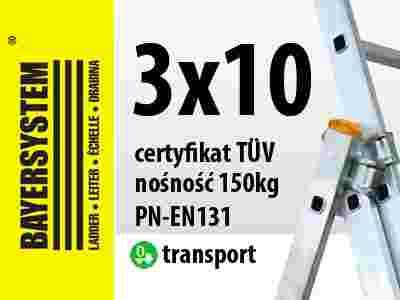 Aluminiowa drabina wielofunkcyjna 3x10 jest znakomitym produktem firmy BAYERSYSTEM. Posiada normę PN EN 131 oraz potwierdzoną nośność na stopień 150kg. Drabina dwustronna z możliwością pionowego rozłożenia i przystawienia np. do ściany budynku. Dodatkowo możliwość wysunięcia trzeciego elementu spełnia funkcję drabiny wolnostojącej. Przed niezamierzonym zsunięciem się elementów wysuwanych drabiny zabezpieczają haki. Bezpieczeństwo zapewniają antypoślizgowe stopnie, szeroki stabilizator umieszczony u jednej z podstaw drabiny, stópki antypoślizgowe z tworzywa sztucznego oraz linka uniemożliwiająca rozsunięcie się drabiny.