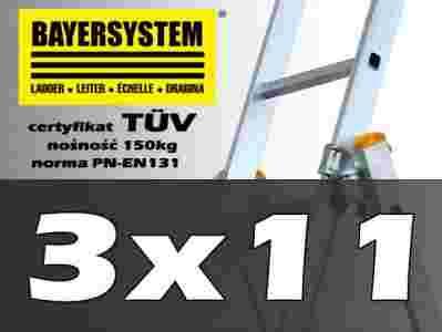 Aluminiowa drabina wielofunkcyjna 3x11 jest znakomitym produktem firmy BAYERSYSTEM. Posiada normę PN EN 131 oraz potwierdzoną nośność na stopień 150kg. Drabina dwustronna z możliwością pionowego rozłożenia i przystawienia np. do ściany budynku. Dodatkowo możliwość wysunięcia trzeciego elementu spełnia funkcję drabiny wolnostojącej. Przed niezamierzonym zsunięciem się elementów wysuwanych drabiny zabezpieczają haki. Bezpieczeństwo zapewniają antypoślizgowe stopnie, szeroki stabilizator umieszczony u jednej z podstaw drabiny, stópki antypoślizgowe z tworzywa sztucznego oraz linka uniemożliwiająca rozsunięcie się drabiny.