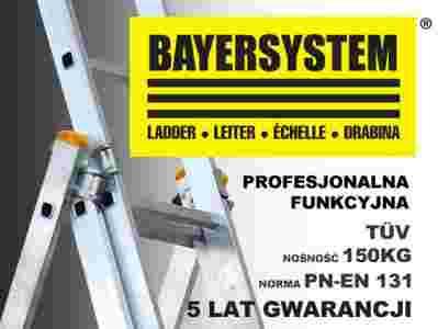 Aluminiowa drabina wielofunkcyjna 3x6 jest znakomitym produktem firmy BAYERSYSTEM. Posiada normę PN EN 131 oraz potwierdzoną nośność na stopień 150kg. Drabina dwustronna z możliwością pionowego rozłożenia i przystawienia np. do ściany budynku. Dodatkowo możliwość wysunięcia trzeciego elementu spełnia funkcję drabiny wolnostojącej. Przed niezamierzonym zsunięciem się elementów wysuwanych drabiny zabezpieczają haki. Bezpieczeństwo zapewniają antypoślizgowe stopnie, szeroki stabilizator umieszczony u jednej z podstaw drabiny, stópki antypoślizgowe z tworzywa sztucznego oraz linka uniemożliwiająca rozsunięcie się drabiny.