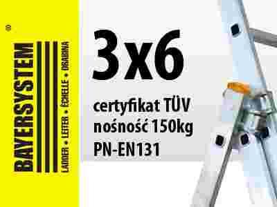 Aluminiowa drabina wielofunkcyjna 3x6 jest znakomitym produktem firmy BAYERSYSTEM. Posiada normę PN EN 131 oraz potwierdzoną nośność na stopień 150kg. Drabina dwustronna z możliwością pionowego rozłożenia i przystawienia np. do ściany budynku. Dodatkowo możliwość wysunięcia trzeciego elementu spełnia funkcję drabiny wolnostojącej. Przed niezamierzonym zsunięciem się elementów wysuwanych drabiny zabezpieczają haki. Bezpieczeństwo zapewniają antypoślizgowe stopnie, szeroki stabilizator umieszczony u jednej z podstaw drabiny, stópki antypoślizgowe z tworzywa sztucznego oraz linka uniemożliwiająca rozsunięcie się drabiny.