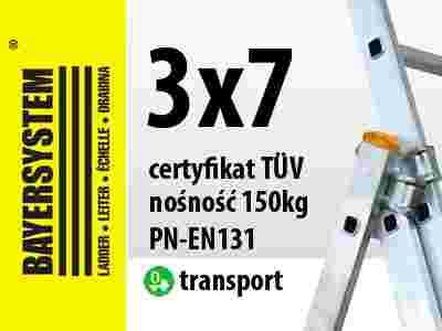 Aluminiowa drabina wielofunkcyjna 3x7 jest znakomitym produktem firmy BAYERSYSTEM. Posiada normę PN EN 131 oraz potwierdzoną nośność na stopień 150kg. Drabina dwustronna z możliwością pionowego rozłożenia i przystawienia np. do ściany budynku. Dodatkowo możliwość wysunięcia trzeciego elementu spełnia funkcję drabiny wolnostojącej. Przed niezamierzonym zsunięciem się elementów wysuwanych drabiny zabezpieczają haki. Bezpieczeństwo zapewniają antypoślizgowe stopnie, szeroki stabilizator umieszczony u jednej z podstaw drabiny, stópki antypoślizgowe z tworzywa sztucznego oraz linka uniemożliwiająca rozsunięcie się drabiny.