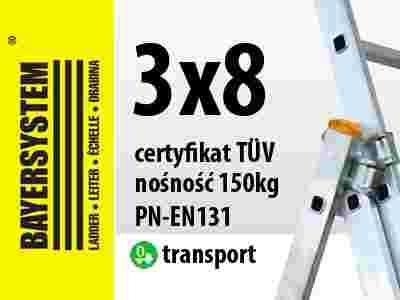 Aluminiowa drabina wielofunkcyjna 3x8 jest znakomitym produktem firmy BAYERSYSTEM. Posiada normę PN EN 131 oraz potwierdzoną nośność na stopień 150kg. Drabina dwustronna z możliwością pionowego rozłożenia i przystawienia np. do ściany budynku. Dodatkowo możliwość wysunięcia trzeciego elementu spełnia funkcję drabiny wolnostojącej. Przed niezamierzonym zsunięciem się elementów wysuwanych drabiny zabezpieczają haki. Bezpieczeństwo zapewniają antypoślizgowe stopnie, szeroki stabilizator umieszczony u jednej z podstaw drabiny, stópki antypoślizgowe z tworzywa sztucznego oraz linka uniemożliwiająca rozsunięcie się drabiny.