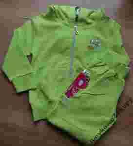Spodnie w kolorze seledynowym, prosty krój, w pasie szeroki ściągacz, na nogawce aplikacja- różowa żabka ozdobiona cekinami
