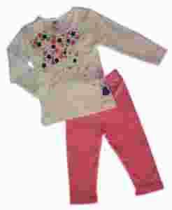REWELACYJNY DWU - CZĘŚCIOWY KOMPLET DZIEWCZĘCY W STU PROCENTACH Z BAWEŁNY. W ZESTAWIE SPODNIE I BLUZKA Z DŁUGIM RĘKAWEM OZDOBIONA MILUTKĄ APLIKACJĄ.