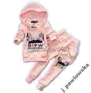 Dres uszyty jest z bawełny. Dół bluzy, rękawy i kaptur zakończone są ściągaczami. Kapturek od wewnątrz wykończony jest różową koronką. Jest także biały sznurek do ściągania. Z takiej samej koronki wykonana jest prześliczna aplikacja (i na brzuszku i na pleckach) w kształcie kokardy na głowie łudząco przypominającej Myszkę Minnie. Pod główką widnieje napis "Blew Beileyiew". Kokarda pokryta jest kryształkami.