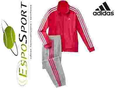 Dres sportowy dziewczęcy Adidas. Bluza zapinana na zamek z kapturem z trzema paskami na zewnętrznej części rękawów. Spodnie dresowe z wyszywanym logo Adidas. Ściągacz w pasie na gumkę, regulowany sznurkiem. Trzy paski na zewnętrznej stronie nogawek.