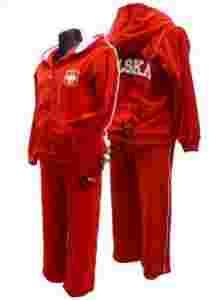 Spodnie z białym lampasem na każdej nogawce oraz biało-czerwoną flagą na lewej nogawce.