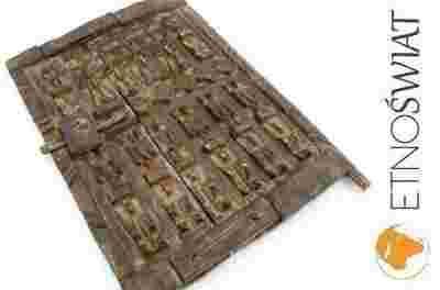 Wyjątkowa, ręcznie wykonana drewniana okiennica. Bogato zdobiona płaskorzeźbami. Charakterystyczna dla plemienia Dogon zamieszkującego Mali.