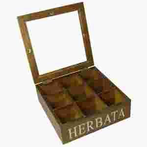 Przedmiotem aukcji jest drewniana szkatułka na herbatę z napisem HERBATA. Wykonana została z drewna i płyty HDF. Posiada dziewięć przegródek na herbatę w torebkach. Napis HERBATA jest posrebrzany.