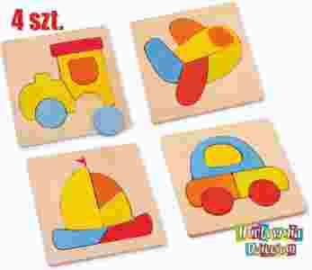 Układanka drewniana dla najmłodszych - nauczy dzieci w rozpoznawaniu kształtów i kolorów. W zestawie cztery kolorowe motywy: samochód, samolot, żaglówka i ciuchcia.