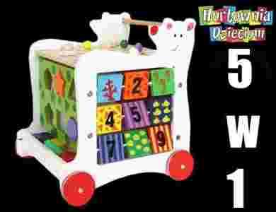 Drewniana zabawka edukacyjna dla najmłodszych z małymi kółeczkami i rączką, dzięki którym pomoże dziecku w stawianiu pierwszych kroków oraz zapewni dużo ciekawej i rozwojowej zabawy. W przerwie od nauki chodzenia dziecko może poćwiczyć pisanie i rysowanie kredą na tablicy, rozwijać koordynację ruchową dopasowując kolorowe drewniane klocki do otworów o różnych kształtach. Kostka posiada również pętle motoryczne do ćwiczenia paluszków, telefon z obrotową tarczą oraz przekręcane puzzle do nauki cyferek.