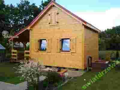 domek nieocieplany o wym.500x500cm plus taras 500x200cm zadaszony balkonem, wydzielone pomieszczenie na np.wc 200x150cm, schody, okna drewniane podwójnie szklone (k=1,1) rozwieralno-uchylne - 6 sztuk, okiennice, drzwi zewnętrzne metalowe antywłamaniowe ocieplane w okleinie drewnopodobnej, drzwi wewnętrzne, deska elewacyjna 28mm na piórowpust (prosta lub półokrągła), deska podłogowa 28mm na piórowpust, dach kryty deską 16mm na piórowpust i gontem bitumicznym lub blachodachówką,