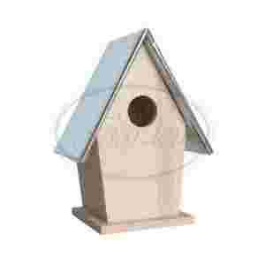 Drewniany domek z blaszanym daszkiem, karmik