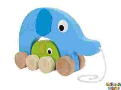 Zabawka motoryczna wykonana z drewna bukowego, dwa wesołe słoniki na kółkach z przyczepionym sznurkiem do ciągnięcia.